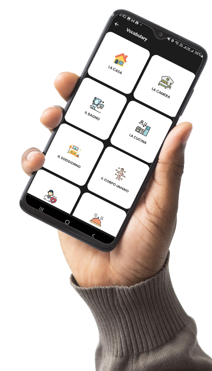 A mobile app allows users to learn Italian anytime, anywhere, fitting language practice into their daily routine. Whether you're on a bus, waiting in line, or relaxing at home, you can easily access lessons and practice on the go.